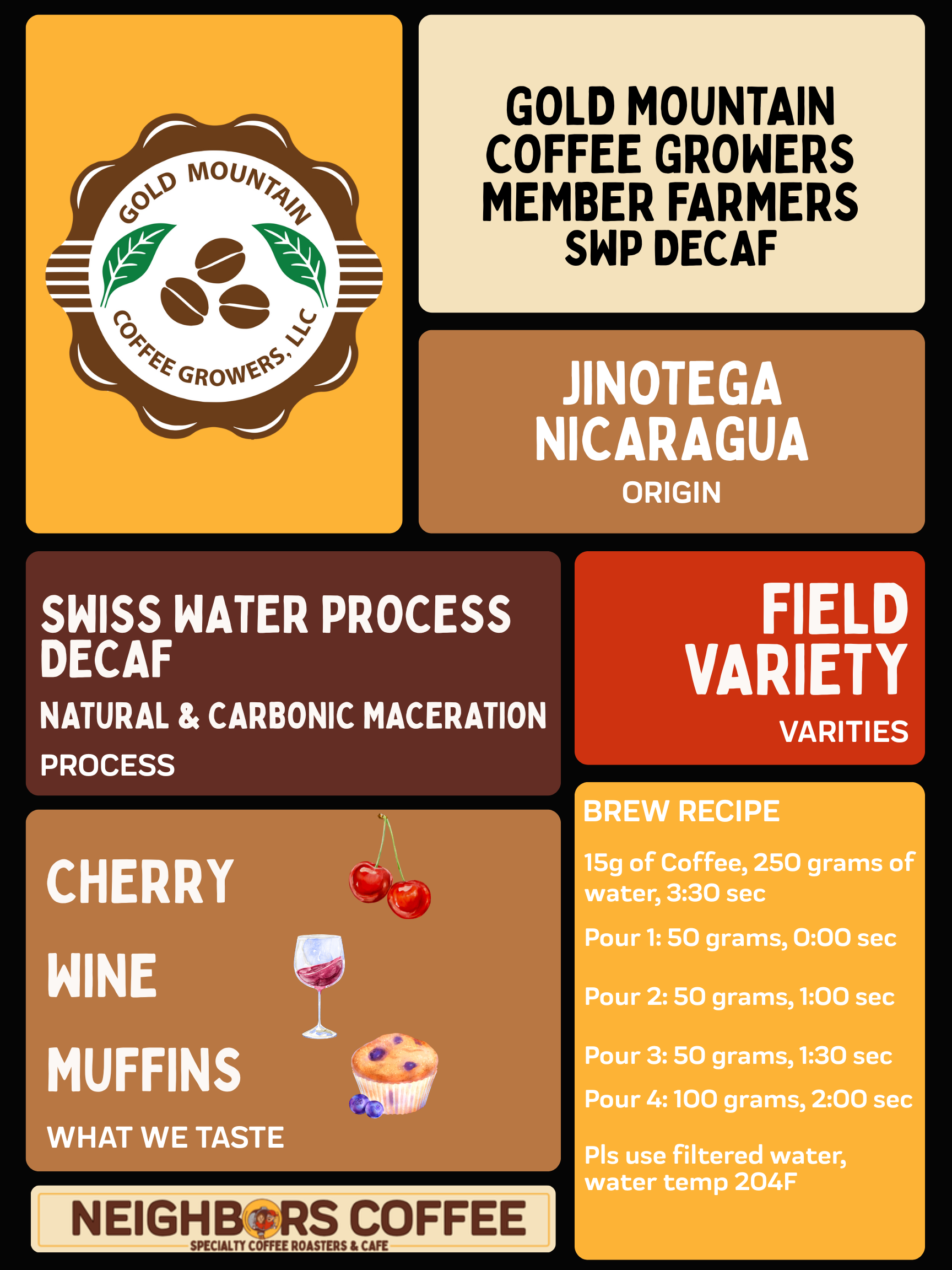 Sourced from the lush highlands of Jinotega, Nicaragua, this coffee is a thoughtfully curated field blend from member farmers of Gold Mountain Coffee Growers — a collective known for quality, sustainability, and innovation at origin. Before decaffeination, only the most expressive coffees were selected: naturally processed and carbonic maceration lots chosen specifically to preserve sweetness and complexity in the final cup.